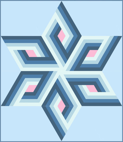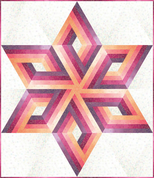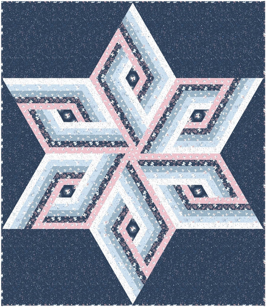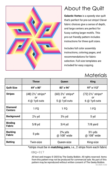 Galactic Vortex is a speedy star quilt that’s perfect for pre-cut strips (jelly rolls)! Clever fabric choices give a sense of depth, and large centers are perfect for fussy cutting larger motifs. This pre-cut friendly pattern includes instructions for three quilt sizes.